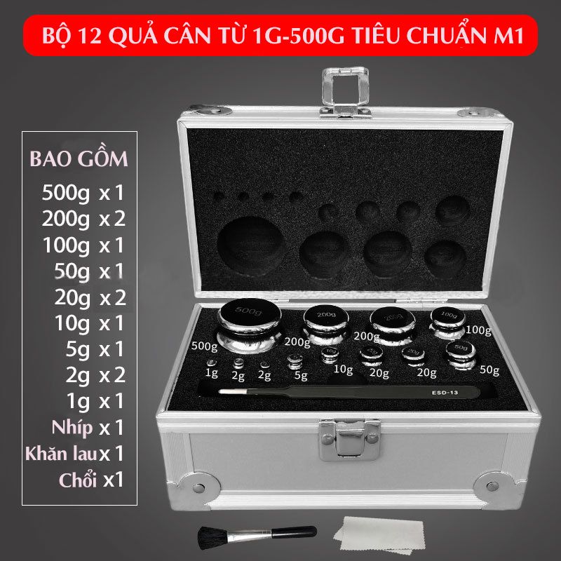 - Bộ trọng lượng chuẩn: 12 quả cân đầy đủ gồm: 1g, 2g, 5g, 10g, 20g, 50g, 100g, 200g, 500g